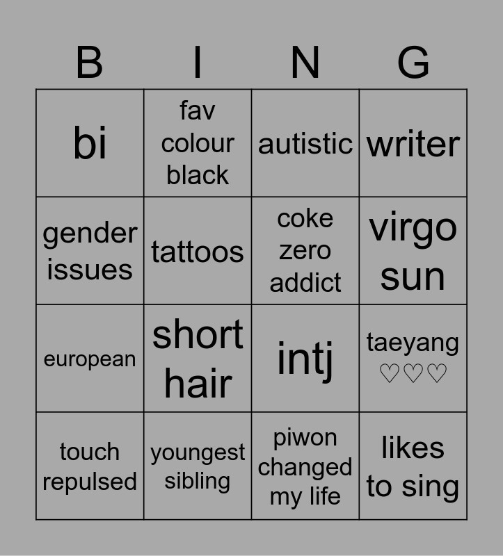 This bingo card has 16 words: youngest sibling, taeyang ♡♡♡, autistic, bi, european, fav colour black, intj, piwon changed my life, gender issues, tattoos, touch repulsed, writer, short hair, virgo sun, coke zero addict and likes to sing.