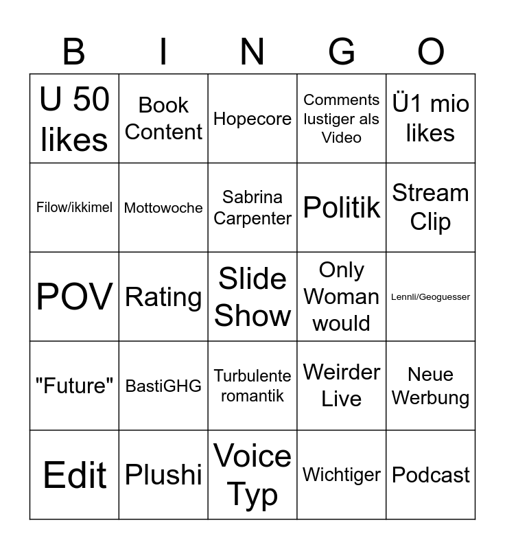 This bingo card has a free space and 24 words: BastiGHG, Plushi, Sabrina Carpenter, Edit, Ü1 mio likes, U 50 likes, Filow/ikkimel, Book Content, Only Woman would, Turbulente romantik, Politik, POV, Weirder Live, Neue Werbung, Mottowoche, Wichtiger, Lennli/Geoguesser, Hopecore, Stream Clip, Rating, Podcast, "Future", Comments lustiger als Video and Voice Typ.