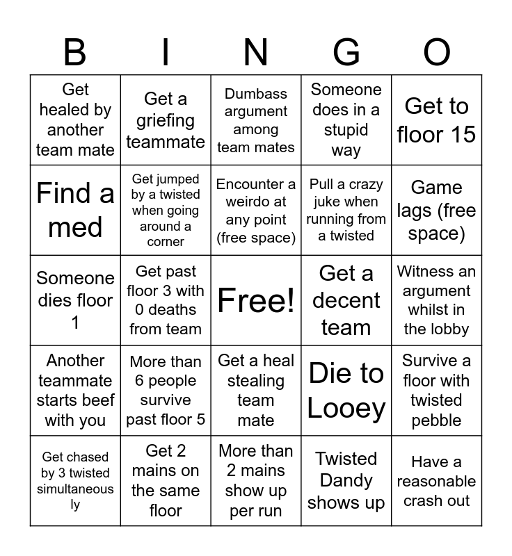 This bingo card has a free space and 24 words: More than 6 people survive past floor 5, Get 2 mains on the same floor, Encounter a weirdo at any point (free space), Get chased by 3 twisted simultaneous ly, Get to floor 15, Get healed by another team mate, Find a med, Get a griefing teammate, Get a decent team, Get a heal stealing team mate, Pull a crazy juke when running from a twisted, Someone dies floor 1, Die to Looey, Survive a floor with twisted pebble, Get jumped by a twisted when going around a corner, Twisted Dandy shows up, Witness an argument whilst in the lobby, Dumbass argument among team mates, Game lags (free space), Get past floor 3 with 0 deaths from team, Have a reasonable crash out, Another teammate starts beef with you, Someone does in a stupid way and More than 2 mains show up per run.