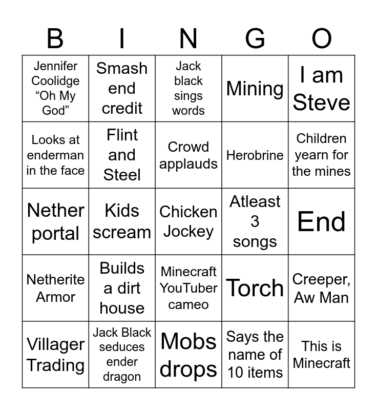 This bingo card has a free space and 24 words: Builds a dirt house, Jack Black seduces ender dragon, Crowd applauds, Villager Trading, I am Steve, Jennifer Coolidge “Oh My God”, Looks at enderman in the face, Smash end credit, Atleast 3 songs, Minecraft YouTuber cameo, Herobrine, Nether portal, Torch, Creeper, Aw Man, Flint and Steel, Says the name of 10 items, End, Jack black sings words, Children yearn for the mines, Kids scream, This is Minecraft, Netherite Armor, Mining and Mobs drops.