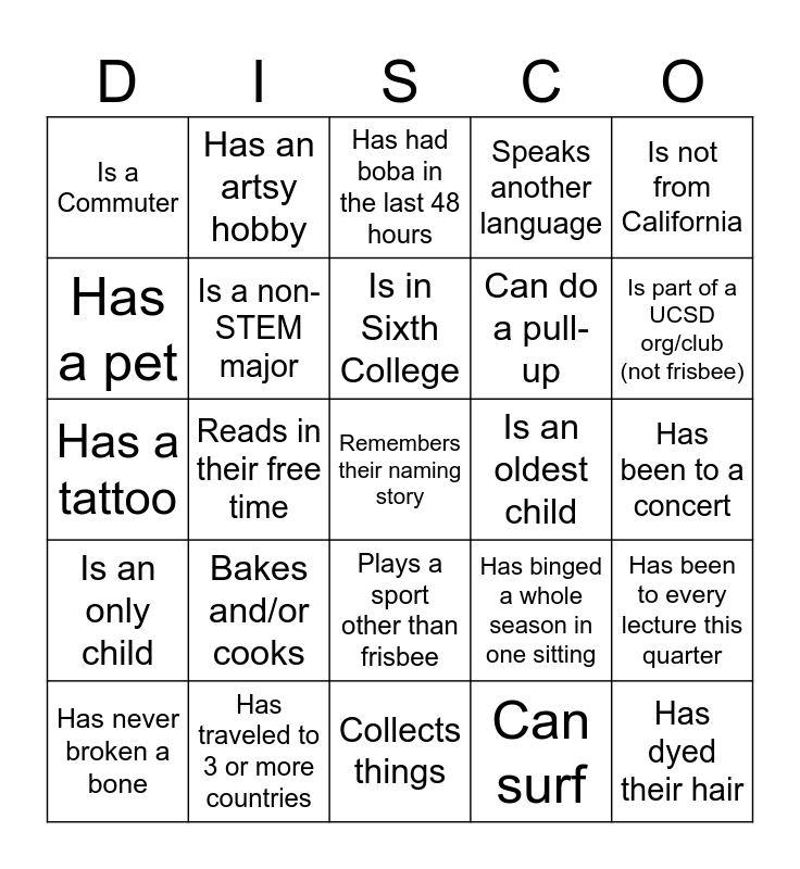 This bingo card has a free space and 24 words: Bakes and/or cooks, Has traveled to 3 or more countries, Is in Sixth College, Has never broken a bone, Is not from California, Is a Commuter, Has a pet, Has an artsy hobby, Is an oldest child, Plays a sport other than frisbee, Can do a pull-up, Has a tattoo, Has binged a whole season in one sitting, Has been to every lecture this quarter, Is a non-STEM major, Can surf, Has been to a concert, Has had boba in the last 48 hours, Is part of a UCSD org/club (not frisbee), Reads in their free time, Has dyed their hair, Is an only child, Speaks another language and Collects things.
