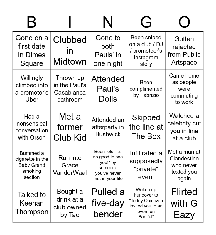 This bingo card has 25 words: Run into Grace VanderWaal, Pulled a five-day bender, Attended Paul's Dolls, Talked to Keenan Thompson, Gotten rejected from Public Artspace, Gone on a first date in Dimes Square, Willingly climbed into a promoter's Uber, Clubbed in Midtown, Skipped the line at The Box, Been told "it's so good to see you!" by someone you've never met in your life, Been complimented by Fabrizio, Had a nonsensical conversation with Orson, Infiltrated a supposedly "private" event, Met a man at Clandestino who never texted you again, Thrown up in the Paul's Casablanca bathroom, Flirted with G Eazy, Watched a celebrity cut you in line at a club, Gone to both Pauls' in one night, Came home as people were commuting to work, Met a former Club Kid, Attended an afterparty in Bushwick, Bought a drink at a club owned by Tao, Bummed a cigarette in the Baby Grand smoking section, Been sniped on a club / DJ / promotoer's instagram story and Woken up hungover to "Teddy Quinlivan invited you to an event on Partiful".