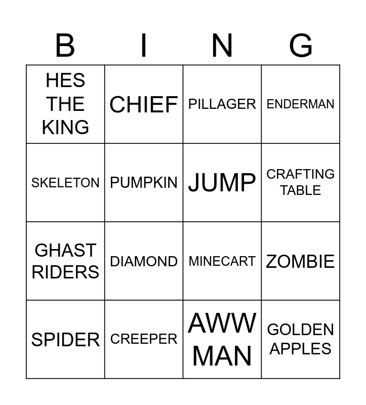This bingo card has 16 words: CREEPER, ZOMBIE, PILLAGER, HES THE KING, GHAST RIDERS, CHIEF, MINECART, AWW MAN, SKELETON, PUMPKIN, SPIDER, ENDERMAN, DIAMOND, CRAFTING TABLE, JUMP and GOLDEN APPLES.