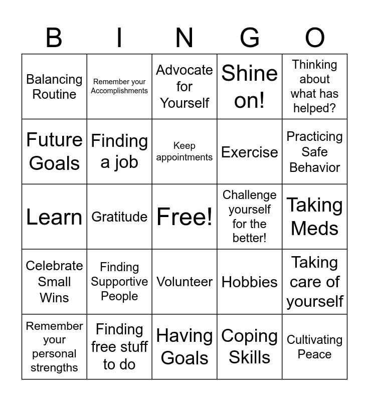 This bingo card has a free space and 24 words: Finding Supportive People, Finding free stuff to do, Keep appointments, Remember your personal strengths, Thinking about what has helped?, Balancing Routine, Future Goals, Remember your Accomplishments, Challenge yourself for the better!, Volunteer, Exercise, Learn, Hobbies, Taking care of yourself, Finding a job, Coping Skills, Taking Meds, Advocate for Yourself, Practicing Safe Behavior, Gratitude, Cultivating Peace, Celebrate Small Wins, Shine on! and Having Goals.