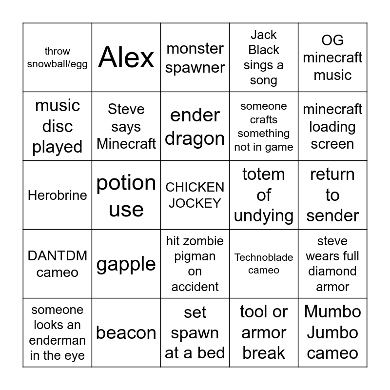 This bingo card has a free space and 24 words: someone looks an enderman in the eye, gapple, ender dragon, tool or armor break, OG minecraft music, throw snowball/egg, Alex, monster spawner, totem of undying, return to sender, Herobrine, Steve says Minecraft, Technoblade cameo, steve wears full diamond armor, music disc played, beacon, set spawn at a bed, Jack Black sings a song, minecraft loading screen, DANTDM cameo, potion use, hit zombie pigman on accident, someone crafts something not in game and Mumbo Jumbo cameo.