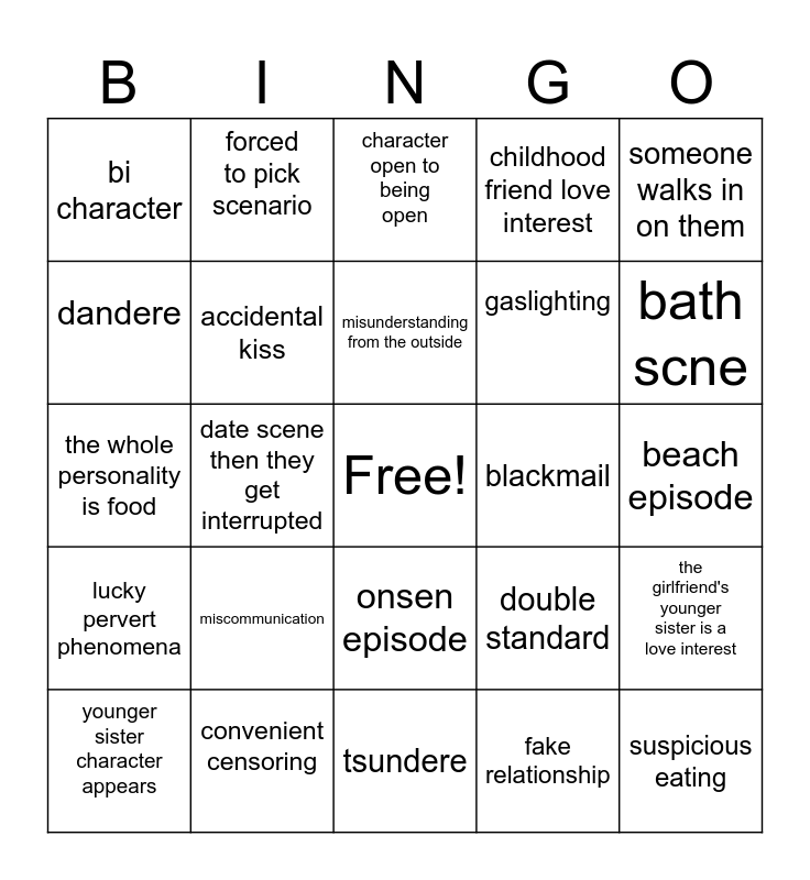 This bingo card has a free space and 24 words: younger sister character appears, miscommunication, misunderstanding from the outside, fake relationship, someone walks in on them, bi character, forced to pick scenario, character open to being open, blackmail, beach episode, the whole personality is food, accidental kiss, double standard, the girlfriend's younger sister is a love interest, dandere, convenient censoring, tsundere, childhood friend love interest, bath scne, lucky pervert phenomena, date scene then they get interrupted, onsen episode, gaslighting and suspicious eating.