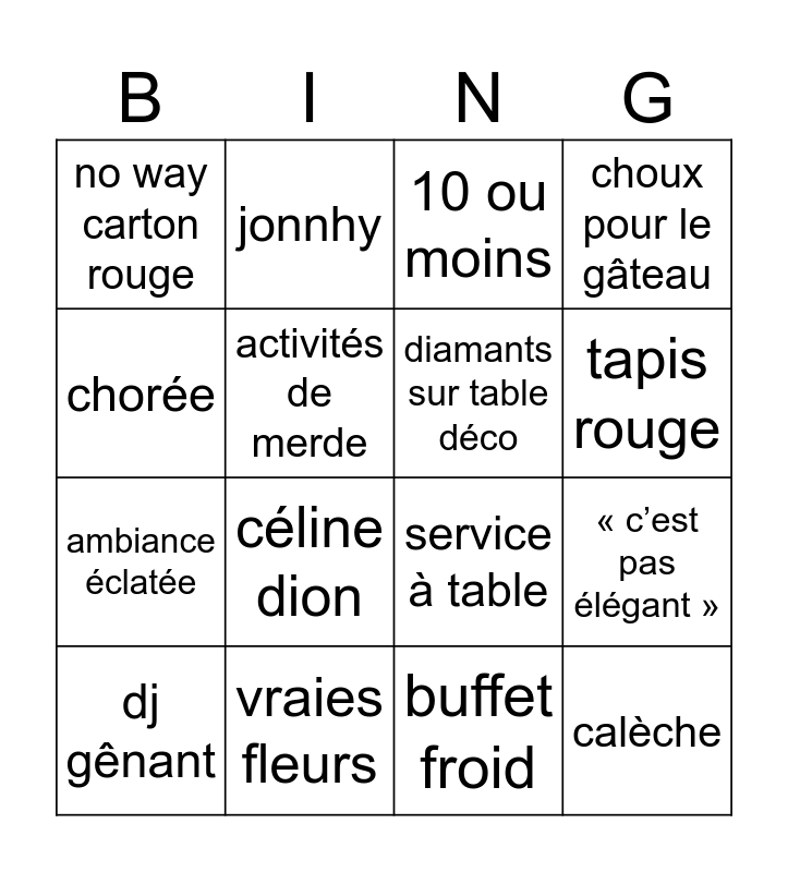 This bingo card has 16 words: vraies fleurs, « c’est pas élégant », 10 ou moins, no way carton rouge, ambiance éclatée, jonnhy, service à table, buffet froid, chorée, activités de merde, dj gênant, choux pour le gâteau, céline dion, tapis rouge, diamants sur table déco and calèche.