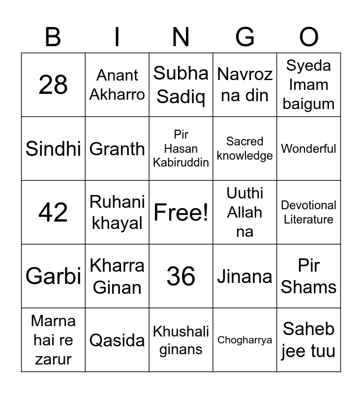 This bingo card has a free space and 24 words: Kharra Ginan, Qasida, Pir Hasan Kabiruddin, Marna hai re zarur, Syeda Imam baigum, 28, Sindhi, Anant Akharro, Uuthi Allah na, 36, Sacred knowledge, 42, Jinana, Pir Shams, Granth, Chogharrya, Devotional Literature, Subha Sadiq, Wonderful, Ruhani khayal, Saheb jee tuu, Garbi, Navroz na din and Khushali ginans.