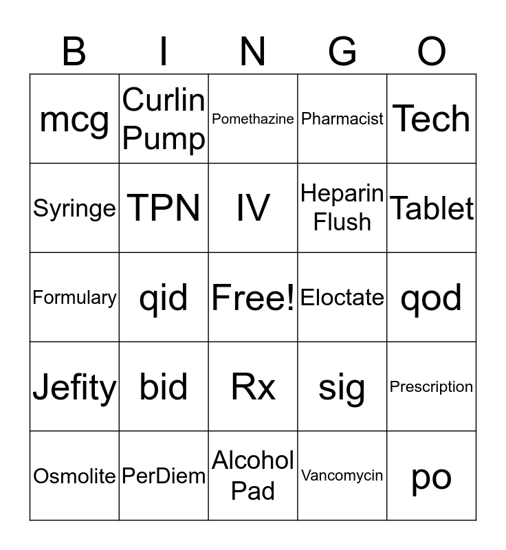 This bingo card has a free space and 28 words: Prescription, Remicade, Heparin Flush, Vancomycin, Syringe, Pomethazine, Curlin Pump, Jefity, Eloctate, Osmolite, Formulary, Pharmacist, PerDiem, Alcohol Pad, Tablet, Pill, bid, TPN, IV, Rx, mcg, hs, po, qid, qod, sig, Tech and Surgilast.