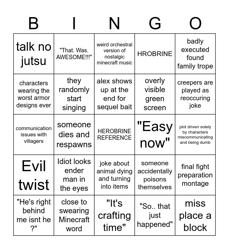 This bingo card has a free space and 24 words: Idiot looks ender man in the eyes, close to swearing Minecraft word, alex shows up at the end for sequel bait, "He's right behind me isnt he ?", badly executed found family trope, talk no jutsu, characters wearing the worst armor designs ever, "That. Was. AWESOME!!!", "Easy now", joke about animal dying and turning into items, overly visible green screen, communication issues with villagers, someone accidentally poisons themselves, final fight preparation montage, they randomly start singing, "So.. that just happened", plot driven solely by characters miscommunicating and being dumb, weird orchestral version of nostalgic minecraft music, creepers are played as reoccuring joke, someone dies and respawns, miss place a block, Evil twist, HROBRINE and "It's crafting time".