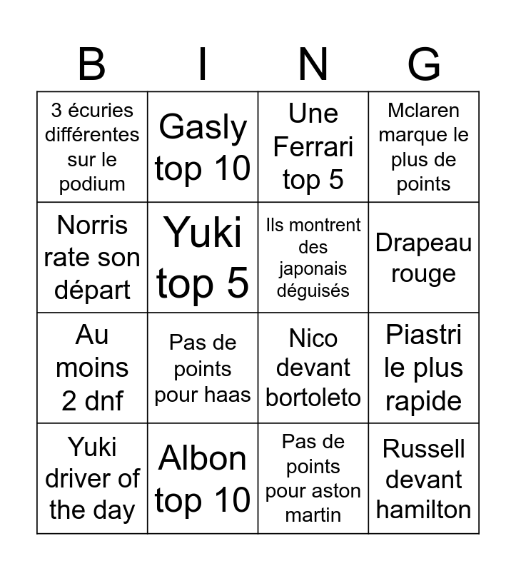This bingo card has 24 words: Du feu, Pneu pluie, Drapeau rouge, Max gagne, Norris rate son départ, 3 écuries différentes sur le podium, Yuki top 5, Gasly top 10, Albon top 10, Au moins une safety car, Au moins 2 dnf, Nico devant bortoleto, Problème aux stands, Accrochage au premier tour, Ils montrent des japonais déguisés, On parle de Jules Bianchi, Pas de points pour aston martin, Une Ferrari top 5, Pas de points pour haas, Piastri le plus rapide, Yuki driver of the day, Russell devant hamilton, Mclaren marque le plus de points and Max prend la tête du championnat.