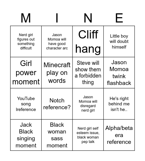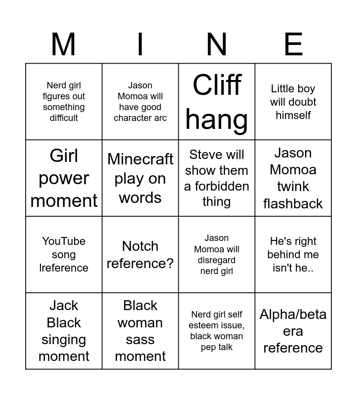 This bingo card has 16 words: Black woman sass moment, He's right behind me isn't he.., Cliff hang, Nerd girl figures out something difficult, YouTube song lreference, Jason Momoa will have good character arc, Jason Momoa will disregard nerd girl, Nerd girl self esteem issue, black woman pep talk, Girl power moment, Minecraft play on words, Jack Black singing moment, Little boy will doubt himself, Notch reference?, Jason Momoa twink flashback, Steve will show them a forbidden thing and Alpha/beta era reference.