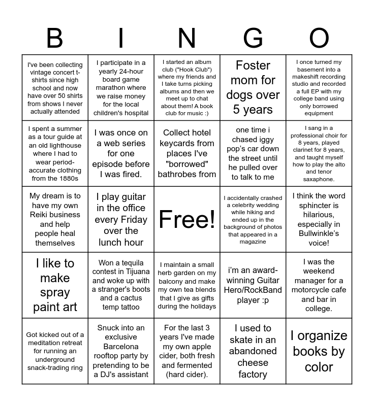 This bingo card has a free space and 24 words: Won a tequila contest in Tijuana and woke up with a stranger's boots and a cactus temp tattoo, Snuck into an exclusive Barcelona rooftop party by pretending to be a DJ's assistant, Collect hotel keycards from places I've "borrowed" bathrobes from, Got kicked out of a meditation retreat for running an underground snack-trading ring, I once turned my basement into a makeshift recording studio and recorded a full EP with my college band using only borrowed equipment, I've been collecting vintage concert t-shirts since high school and now have over 50 shirts from shows I never actually attended, I spent a summer as a tour guide at an old lighthouse where I had to wear period-accurate clothing from the 1880s, I participate in a yearly 24-hour board game marathon where we raise money for the local children's hospital, I accidentally crashed a celebrity wedding while hiking and ended up in the background of photos that appeared in a magazine, I maintain a small herb garden on my balcony and make my own tea blends that I give as gifts during the holidays, one time i chased iggy pop’s car down the street until he pulled over to talk to me, My dream is to have my own Reiki business and help people heal themselves, i’m an award-winning Guitar Hero/RockBand player :p, I was the weekend manager for a motorcycle cafe and bar in college., I was once on a web series for one episode before I was fired., I used to skate in an abandoned cheese factory, I think the word sphincter is hilarious, especially in Bullwinkle’s voice!, I started an album club ("Hook Club") where my friends and I take turns picking albums and then we meet up to chat about them! A book club for music :), I sang in a professional choir for 8 years, played clarinet for 8 years, and taught myself how to play the alto and tenor saxaphone., I play guitar in the office every Friday over the lunch hour, I organize books by color, I like to make spray paint art, Foster mom for dogs over 5 years and For the last 3 years I've made my own apple cider, both fresh and fermented (hard cider)..