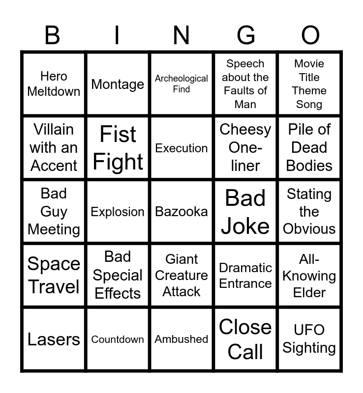 This bingo card has 27 words: Dramatic Entrance, UFO Sighting, Cheesy One-liner, Ambushed, Villain with an Accent, Archeological Find, Montage, Space Travel, Bad Joke, All-Knowing Elder, Bad Guy Meeting, Speech about the Faults of Man, Lasers, Countdown, Pile of Dead Bodies, Ending a Phone Call Abruptly, Fist Fight, Execution, Bad Special Effects, Hero Meltdown, Stating the Obvious, Close Call, Explosion, Bazooka, Giant Creature Attack, Movie Title Theme Song and Eaten Alive.