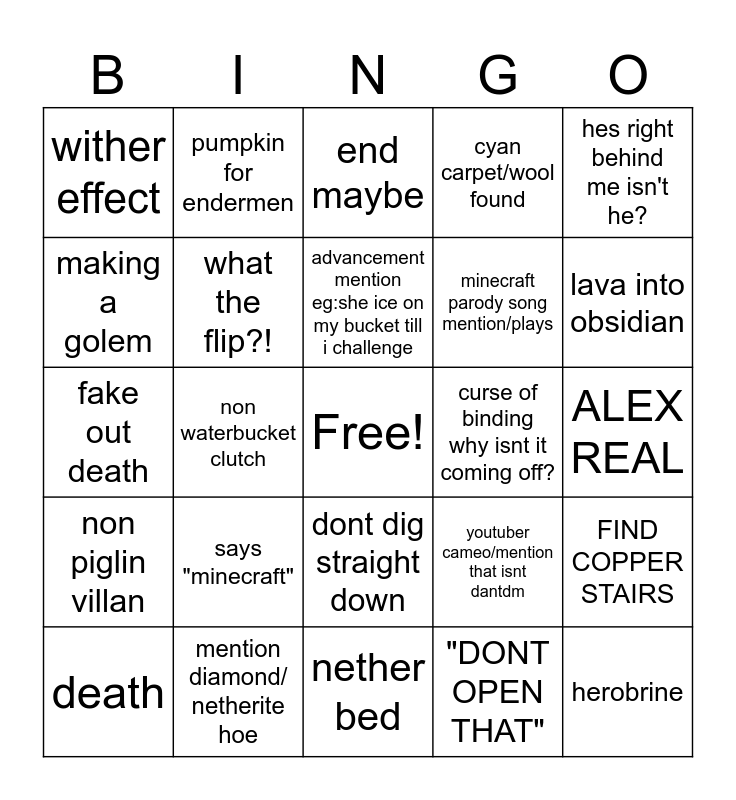 This bingo card has a free space and 24 words: says "minecraft", mention diamond/ netherite hoe, advancement mention eg:she ice on my bucket till i challenge, death, hes right behind me isn't he?, wither effect, making a golem, pumpkin for endermen, curse of binding why isnt it coming off?, dont dig straight down, minecraft parody song mention/plays, fake out death, youtuber cameo/mention that isnt dantdm, FIND COPPER STAIRS, what the flip?!, "DONT OPEN THAT", ALEX REAL, end maybe, lava into obsidian, non waterbucket clutch, herobrine, non piglin villan, cyan carpet/wool found and nether bed.