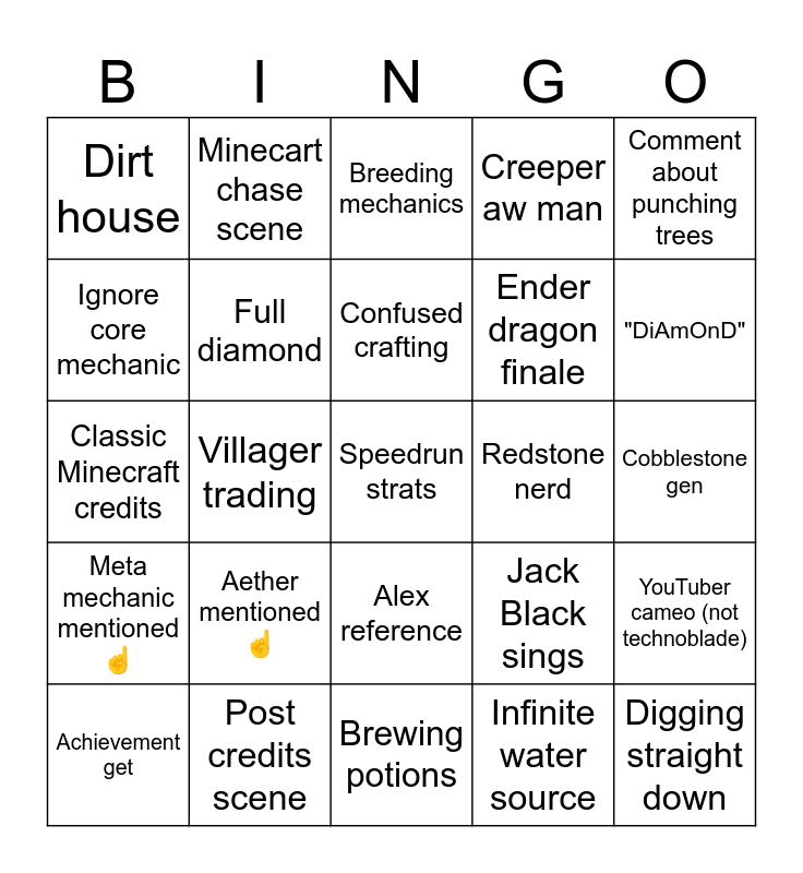 This bingo card has a free space and 24 words: Aether mentioned ☝️, Post credits scene, Confused crafting, Achievement get, Comment about punching trees, Dirt house, Ignore core mechanic, Minecart chase scene, Redstone nerd, Alex reference, Ender dragon finale, Classic Minecraft credits, Jack Black sings, YouTuber cameo (not technoblade), Full diamond, Infinite water source, Cobblestone gen, Breeding mechanics, "DiAmOnD", Villager trading, Digging straight down, Meta mechanic mentioned ☝️, Creeper aw man and Brewing potions.