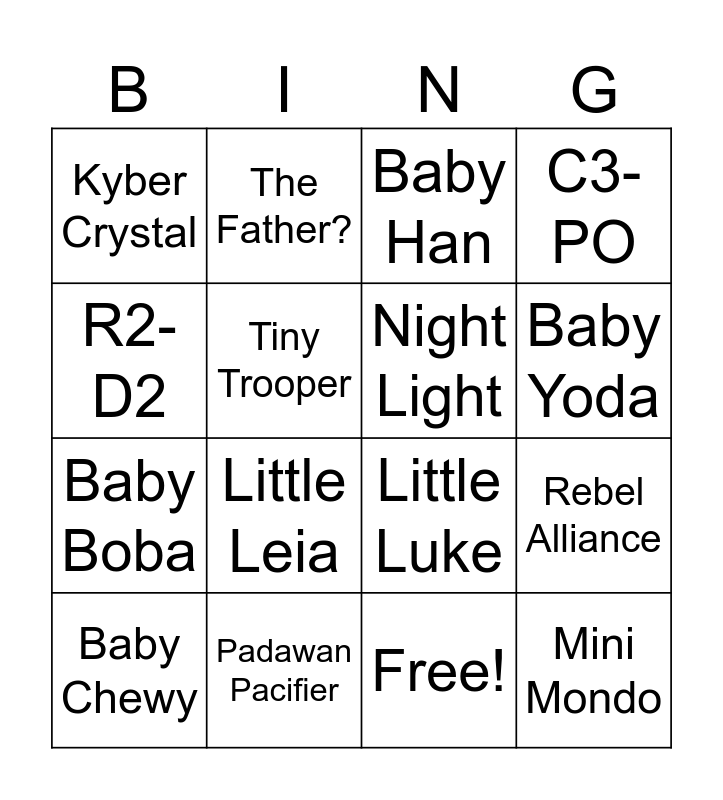 This bingo card has 17 words: Free!, Baby Chewy, Baby Han, Kyber Crystal, Little Leia, C3-PO, Rebel Alliance, Night Light, Baby Yoda, Tiny Trooper, Padawan Pacifier, Little Luke, R2-D2, The Father?, Baby Boba, Blue Milk and Mini Mondo.