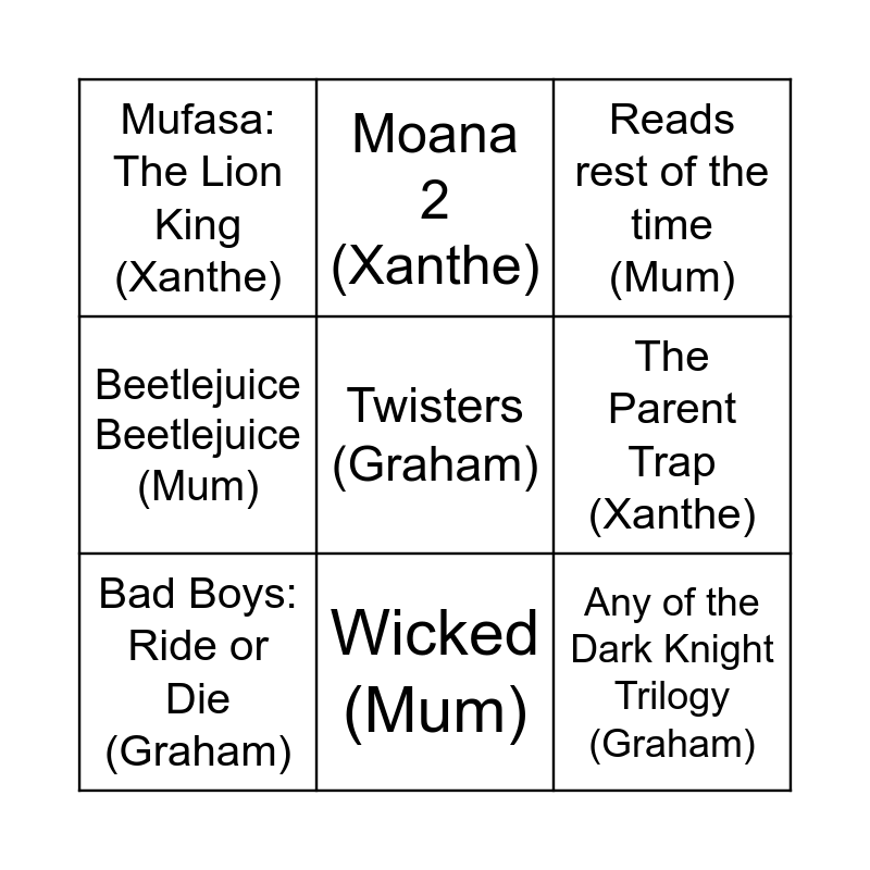 This bingo card has 10 words: Free!, Mufasa: The Lion King (Xanthe), Moana 2 (Xanthe), The Parent Trap (Xanthe), Beetlejuice Beetlejuice (Mum), Wicked (Mum), Reads rest of the time (Mum), Bad Boys: Ride or Die (Graham), Twisters (Graham) and Any of the Dark Knight Trilogy (Graham).