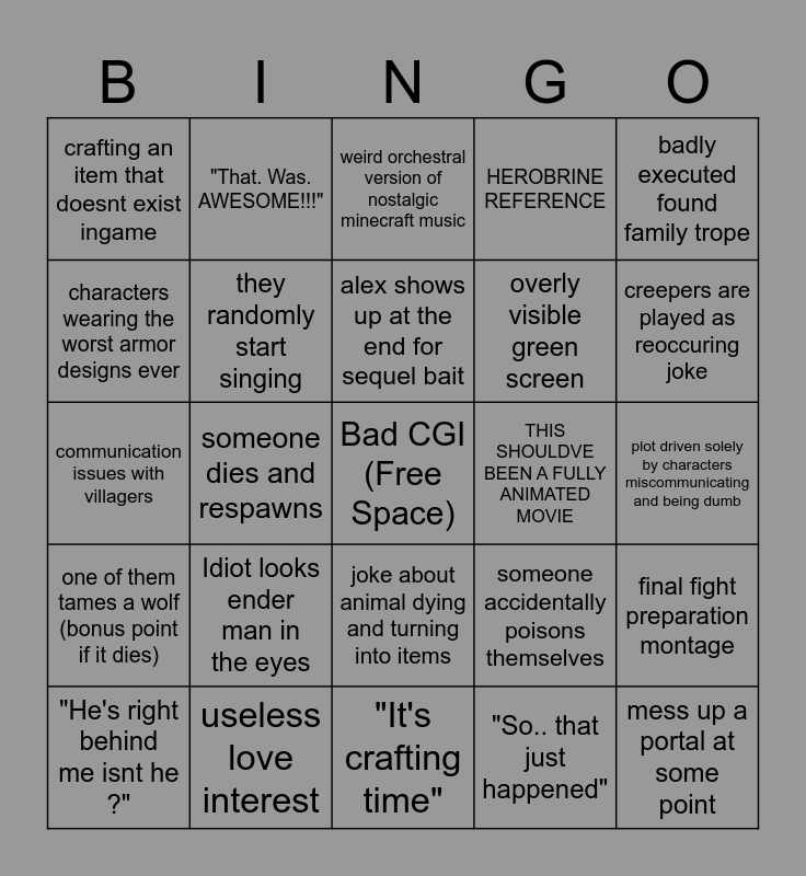 This bingo card has a free space and 24 words: Idiot looks ender man in the eyes, useless love interest, alex shows up at the end for sequel bait, "He's right behind me isnt he ?", badly executed found family trope, crafting an item that doesnt exist ingame, characters wearing the worst armor designs ever, "That. Was. AWESOME!!!", THIS SHOULDVE BEEN A FULLY ANIMATED MOVIE, joke about animal dying and turning into items, overly visible green screen, communication issues with villagers, someone accidentally poisons themselves, final fight preparation montage, they randomly start singing, "So.. that just happened", plot driven solely by characters miscommunicating and being dumb, weird orchestral version of nostalgic minecraft music, creepers are played as reoccuring joke, someone dies and respawns, mess up a portal at some point, one of them tames a wolf (bonus point if it dies), HEROBRINE REFERENCE and "It's crafting time".