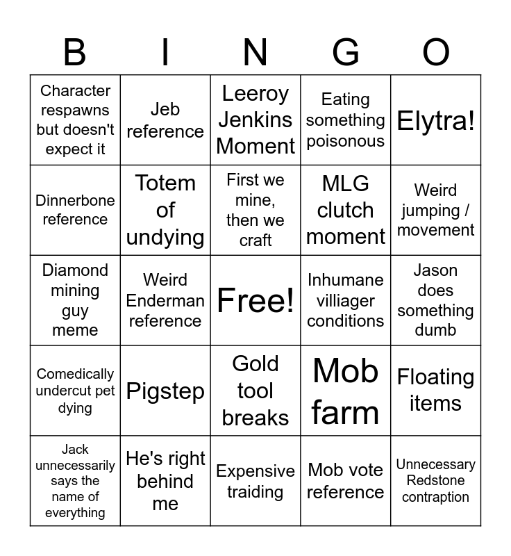 This bingo card has a free space and 24 words: Pigstep, He's right behind me, First we mine, then we craft, Jack unnecessarily says the name of everything, Elytra!, Character respawns but doesn't expect it, Dinnerbone reference, Jeb reference, Inhumane villiager conditions, Gold tool breaks, MLG clutch moment, Diamond mining guy meme, Mob farm, Floating items, Totem of undying, Mob vote reference, Jason does something dumb, Leeroy Jenkins Moment, Weird jumping / movement, Weird Enderman reference, Unnecessary Redstone contraption, Comedically undercut pet dying, Eating something poisonous and Expensive traiding.