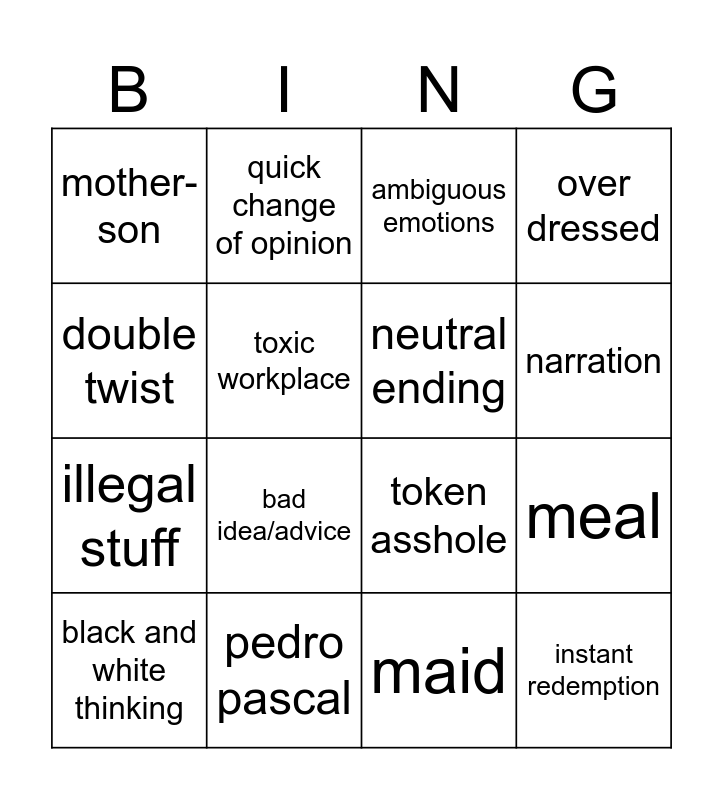 This bingo card has 16 words: pedro pascal, meal, ambiguous emotions, mother-son, illegal stuff, quick change of opinion, token asshole, maid, double twist, toxic workplace, black and white thinking, over dressed, bad idea/advice, narration, neutral ending and instant redemption.