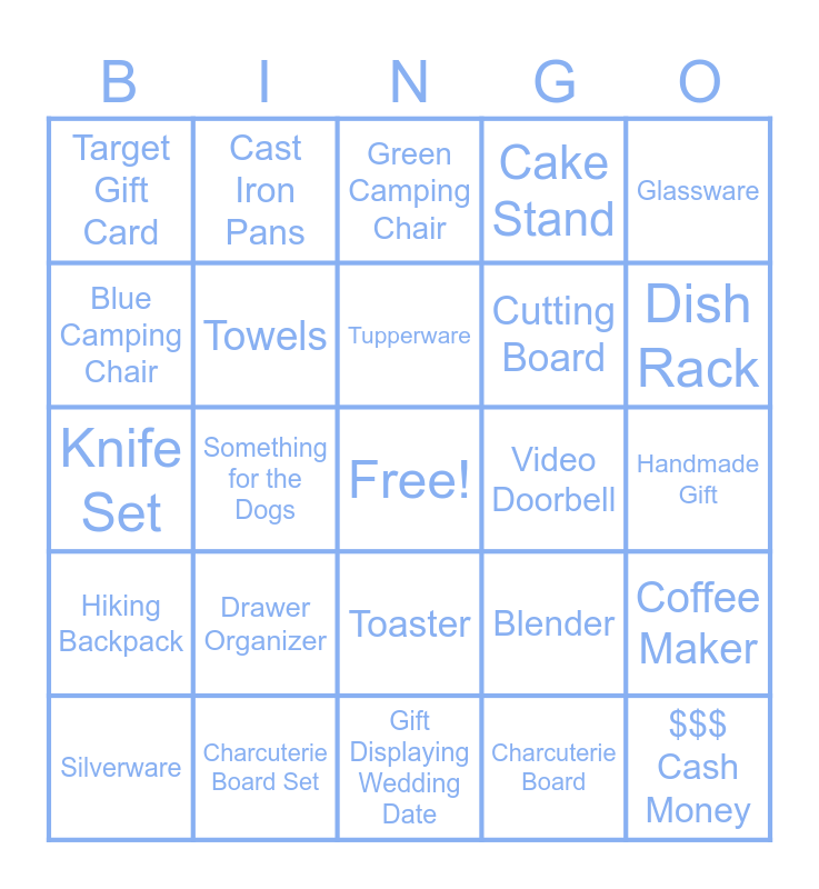 This bingo card has a free space and 28 words: Coffee Maker, Amazon Echo, Cutting Board, Charcuterie Board, Blue Camping Chair, Green Camping Chair, Cast Iron Pans, Hiking Backpack, Video Doorbell, Silverware, Knife Set, Cake Stand, Charcuterie Board Set, Gift Displaying Wedding Date, Dish Rack, Safe, Drawer Organizer, Towels, Tupperware, Toaster, Target Gift Card, Amazon Gift Card, $$$ Cash Money, Something for the Dogs, Handmade Gift, Blender, Glassware and Bedding.