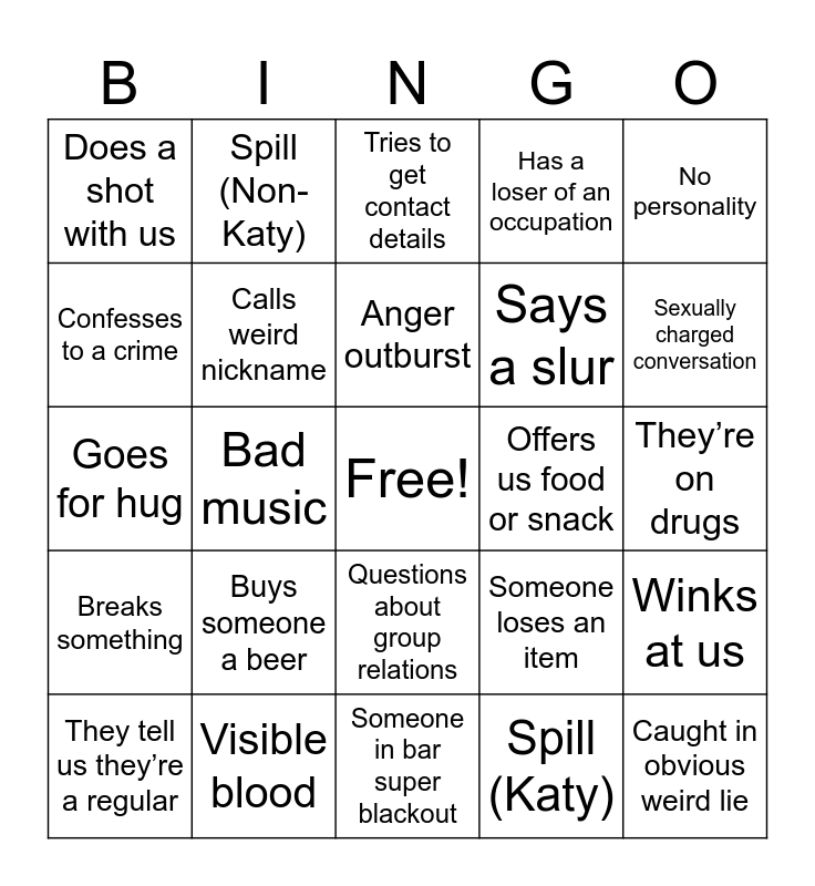 This bingo card has a free space and 37 words: Tries to hold hand, Asks to go outside, Run into previous character, Calls weird nickname, Winks at us, Buys someone a beer, Anger outburst, They break the conversation, No personality, Definitely a serial killer, Bad music, Has a loser of an occupation, Caught in obvious weird lie, They’re on drugs, Confesses to a crime, Breaks something, Spitter when talking, Tries to get contact details, Questions about group relations, Offers us food or snack, Does a shot with us, Sexually charged conversation, They tell us they’re a regular, Someone in bar super blackout, Spill (NPC), Spill (Katy), Spill (Non-Katy), Anyone kicked out, Introduced to their friend, 11, Opp/NPC lookalike, Visible blood, Goes for hug, Telling an incoherent story, Someone loses an item, Says a slur and Bartender free drink.