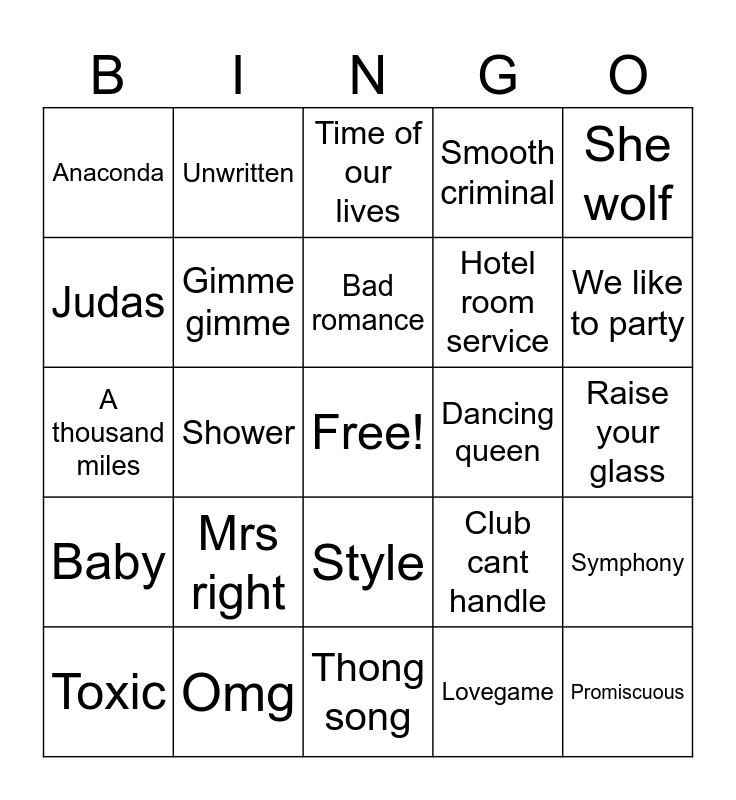 This bingo card has a free space and 74 words: I gotta feeling, Dynamite, Time of our lives, Disturbia, Starships, S&M, Whistle, Dont stop the music, Toxic, Oops i did it again, Only girl, Baby one more time, Bad romance, Judas, Die young, Shower, Boom boom boom boom, We like to party, Hey ya, A thousand miles, Gimme gimme, Unwritten, Smooth criminal, Gee, Promiscuous, Like a G6, Good girls go bad, SOS, Gold digger, Milkshake, She wolf, Circus, Super bass, Boom pow, Telephone, Lovegame, Gasolina, Closer, Shake it, Tiktok, Thong song, Omg, No hands, Get low, The night is still young, Anaconda, Hey baby, Mrs right, Candy, Plan b, Fly me to the moon, Pink pony club, Raise your glass, My way, You belong with me, 22, Style, Timber, Good time, Symphony, Hotel room service, Beauty and the beat, Baby, Umbrella, Dancing queen, Girls jusy wanna have fun, Lay all your love, Right round, Club cant handle, Down, Fire burning, Party in the usa, Popular and Please please please.