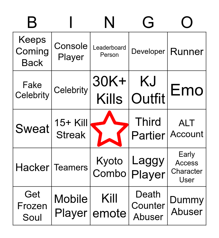 This bingo card has a free space and 24 words: Teamers, Mobile Player, 30K+ Kills, Get Frozen Soul, Runner, Keeps Coming Back, Fake Celebrity, Console Player, Third Partier, Kyoto Combo, KJ Outfit, Sweat, Laggy Player, Early Access Character User, Celebrity, Death Counter Abuser, ALT Account, Leaderboard Person, Emo, 15+ Kill Streak, Dummy Abuser, Hacker, Developer and Kill emote.