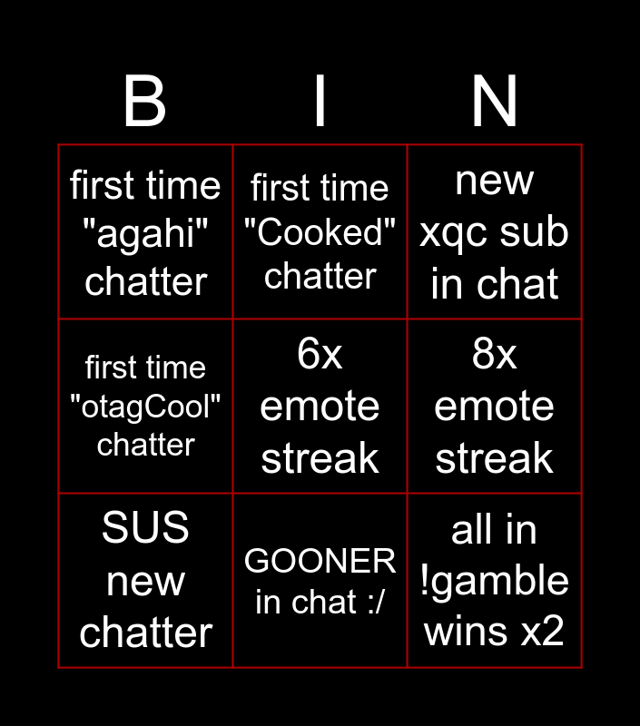 This bingo card has a free space and 8 words: 8x emote streak, new xqc sub in chat, first time "Cooked" chatter, SUS new chatter, first time "agahi" chatter, all in !gamble wins x2, first time "otagCool" chatter and GOONER in chat :/.