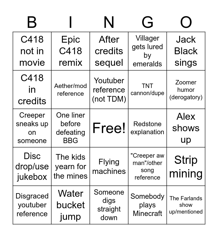 This bingo card has a free space and 24 words: The kids yearn for the mines, Water bucket jump, Youtuber reference (not TDM), Disgraced youtuber reference, Jack Black sings, C418 not in movie, C418 in credits, Epic C418 remix, Redstone explanation, Flying machines, TNT cannon/dupe, Creeper sneaks up on someone, "Creeper aw man"/other song reference, Strip mining, Aether/mod reference, Somebody plays Minecraft, Alex shows up, After credits sequel, Zoomer humor (derogatory), One liner before defeating BBG, The Farlands show up/mentioned, Disc drop/use jukebox, Villager gets lured by emeralds and Someone digs straight down.