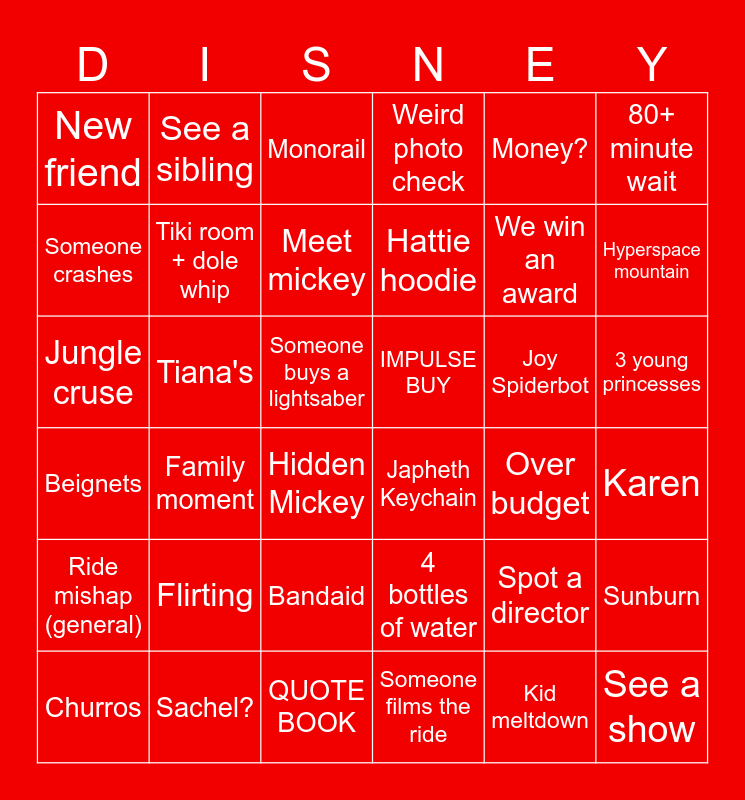 This bingo card has 57 words: Naptime, Hidden Mickey, Random noises from hattie, New friend, Over budget, New joiner, Someone crashes, Hattie fights someone, Meet mickey, Ride breaks, Weird photo check, See a show, Spot a director, 4 bottles of water, Spot a vlogger, Sunburn, Money?, Hyperspace mountain, Radiator racers, Jungle cruse, Tiana's, Churros, Beignets, Monorail, Emma hat, Tiki room + dole whip, Bandaid, AJ hat, Hattie hoodie, Sachel?, Finch completion, Kid meltdown, Find the bound, Cool cast member, Someone buys a lightsaber, 80+ minute wait, 40+ miles, We win an award, Midevial times win, IMPULSE BUY, See a sibling, 3 young princesses, Ride mishap (general), Food tragedy, DUCK FAMILY, Try something new, Joy Spiderbot, Japheth Keychain, IOU, Someone films the ride, Flirting, Karen, QUOTE BOOK, Family with matching shirts, Bickering, Family moment and The chosen one.