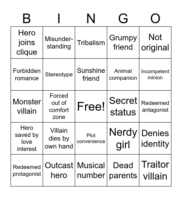 This bingo card has a free space and 24 words: Villain dies by own hand, Outcast hero, Sunshine friend, Redeemed protagonist, Not original, Hero joins clique, Forbidden romance, Misunder-standing, Secret status, Plot convenience, Animal companion, Monster villain, Nerdy girl, Denies identity, Stereotype, Dead parents, Redeemed antagonist, Tribalism, Incompetent minion, Forced out of comfort zone, Traitor villain, Hero saved by love interest, Grumpy friend and Musical number.