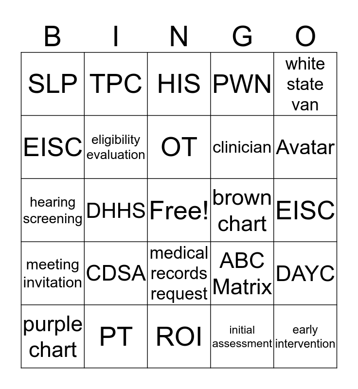 This bingo card has a free space and 24 words: CDSA, PT, OT, purple chart, white state van, SLP, EISC, TPC, brown chart, medical records request, clinician, hearing screening, ABC Matrix, DAYC, eligibility evaluation, initial assessment, EISC, HIS, Avatar, DHHS, early intervention, meeting invitation, PWN and ROI.