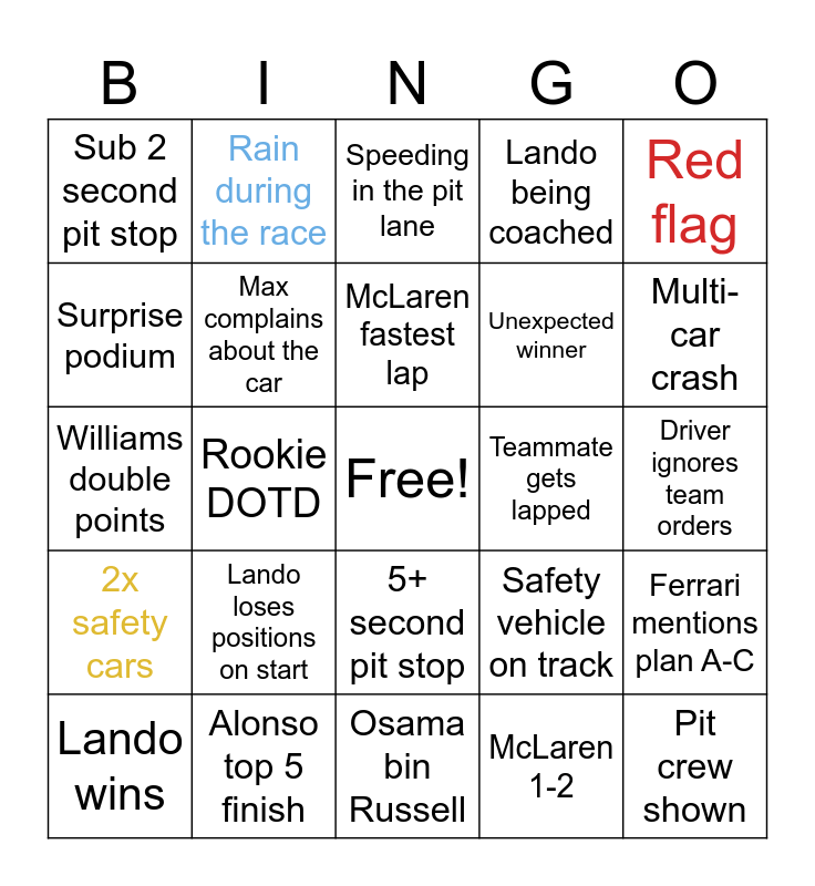 This bingo card has a free space and 102 words: Yuki DNFs, Grass on fire, Red flag, Lap 1 incident, Safety car, Ferrari radio moment, 3+ drivers DNF, Rookie DNFs, Pit stop issues, "Papaya rules", Jump start, Race over 2 hours, Antonelli wins, Virtual safety car, "Box, Box, Box", 2x red flags, 2x safety cars, Team double DNF, All drivers finish, Time penalty, Last lap overtake, Yuki podium, Lawson > Yuki, Sauber in the top 10, Unexpected podium, Multi-car crash, Lando being coached, Lando loses positions on start, Driver swears on radio, Yuki complains about the car, Rain during the race, Speeding in the pit lane, Unsafe release, Pit lane start, Safety car finish, 5+ second pit stop, Teammates crash into each other, Commentator's curse, Williams double points, McLaren 1-2, Yuki wins, Leclerc wins, Lando wins, Piastri wins, Verstappen wins, Hamilton wins, Russell wins, Unexpected winner, Mechanical failure, Commentator says something weird, Graphic issues, Rookie on podium, Surprise podium, Yuki > Max, Ferrari disasterclass, Fans shown, Max & Lando battle for over 5 laps, Max DNF, Funny team radio, Pit crew shown, Debris on track, British driver on podium, Sbinalla, Lawson in the points, Driver argues on team radio, McLaren favoritism for Lando, Animal on track, Driver ignores team orders, Rookie DOTD, Alonso top 5 finish, Car on fire, Doohan DNFs, HES LOCKING HIS BRAKES UP, Camera cuts away mid battle, Front wing damage, Fans wave at camera, Max complains about the car, Backmarker team leads a lap, Teammates battle, Driver makes up 10+ positions, Driver stops in wrong box, Less than 5 second finishing margin, Debris on track, Teammate gets lapped, Incident in the chicane, McLaren fastest lap, Stroll > Alonso, Lewis > Leclerc, Albon > Sainz, Piastri > Lando, Antonelli > Russell, Safety vehicle on track, Bollard hit, Lawson overtakes yuki, Stroll DNFs, Osama bin Russell, Sub 2 second pit stop, MaFIA, Ferrari mentions plan A-C, Race cancelled, Masterclass strategy and Special livery mentioned.