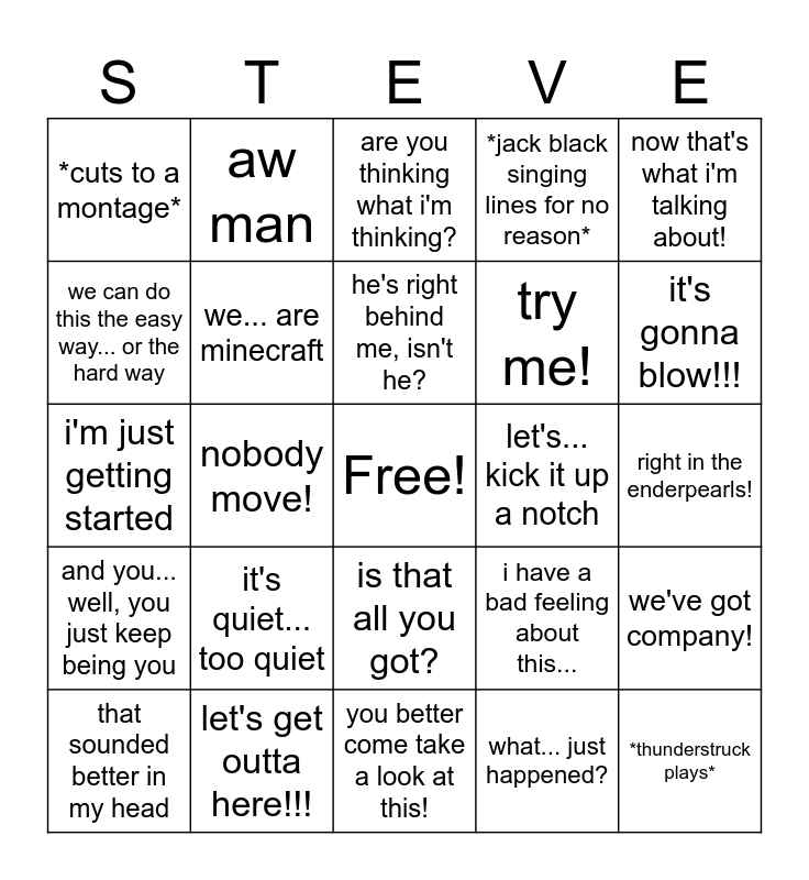 This bingo card has a free space and 24 words: it's quiet... too quiet, let's get outta here!!!, he's right behind me, isn't he?, that sounded better in my head, now that's what i'm talking about!, *cuts to a montage*, we can do this the easy way... or the hard way, aw man, let's... kick it up a notch, is that all you got?, try me!, i'm just getting started, i have a bad feeling about this..., we've got company!, we... are minecraft, what... just happened?, right in the enderpearls!, are you thinking what i'm thinking?, it's gonna blow!!!, nobody move!, *thunderstruck plays*, and you... well, you just keep being you, *jack black singing lines for no reason* and you better come take a look at this!.