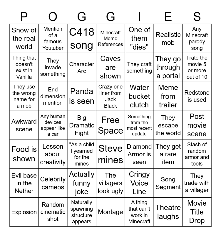This bingo card has a free space and 48 words: Cringy Voice Line, They go through a portal, Montage, Any human devices appear like a car, Panda is seen, Post movie scene, Mention of a famous Youtuber, Random cinematic shot, Realistic mob, Steve mines, Any Minecraft parody song, Minecraft Meme References, Meme from trailer, Water bucket clutch, Evil base in the Nether, They escape the world, Thing that doesn't exist in Vanilla, I rate the movie 5 or more out of 10, Song Segment, One of them "dies", They craft something, Big Dramatic Fight, Show of the real world, They invade something, They trade with a villager, Character Arc, Redstone is used, Explosion, Crazy one liner from Jack Black, End dimension mention, Theatre laughs, Something from the most recent update, Stash of random armor and tools, Celebrity cameos, Awkward scene, Diamond Armor is seen, They get a rare item, They use the wrong name for a mob, "As a child I yearned for the mines, Actually funny joke, Food is shown, Movie Title Drop, C418 song, Naturally spawning structure appears, Caves are shown, The villagers look ugly, Lesson about creativity and A thing that can't work in Minecraft.
