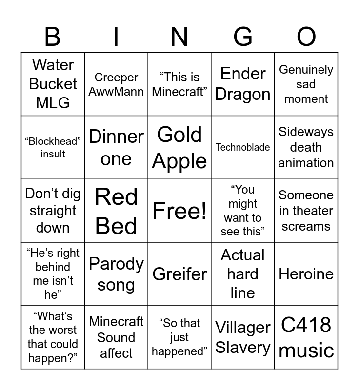 This bingo card has a free space and 28 words: Heroine, Water Sheep, Technoblade, Villager Slavery, “Blockhead” insult, “This is Minecraft”, Creeper AwwMann, “He’s right behind me isn’t he”, “You might want to see this”, “What’s the worst that could happen?”, Don’t dig straight down, Ender Dragon, Minecraft Sound affect, “So that just happened”, Sideways death animation, Totem, Parody song, Dinner one, Gold Apple, Greifer, Water Bucket MLG, “I’m thinkin I like that name”, C418 music, Red Bed, Someone in theater screams, Actual hard line, Genuinely sad moment and Terraria reference.