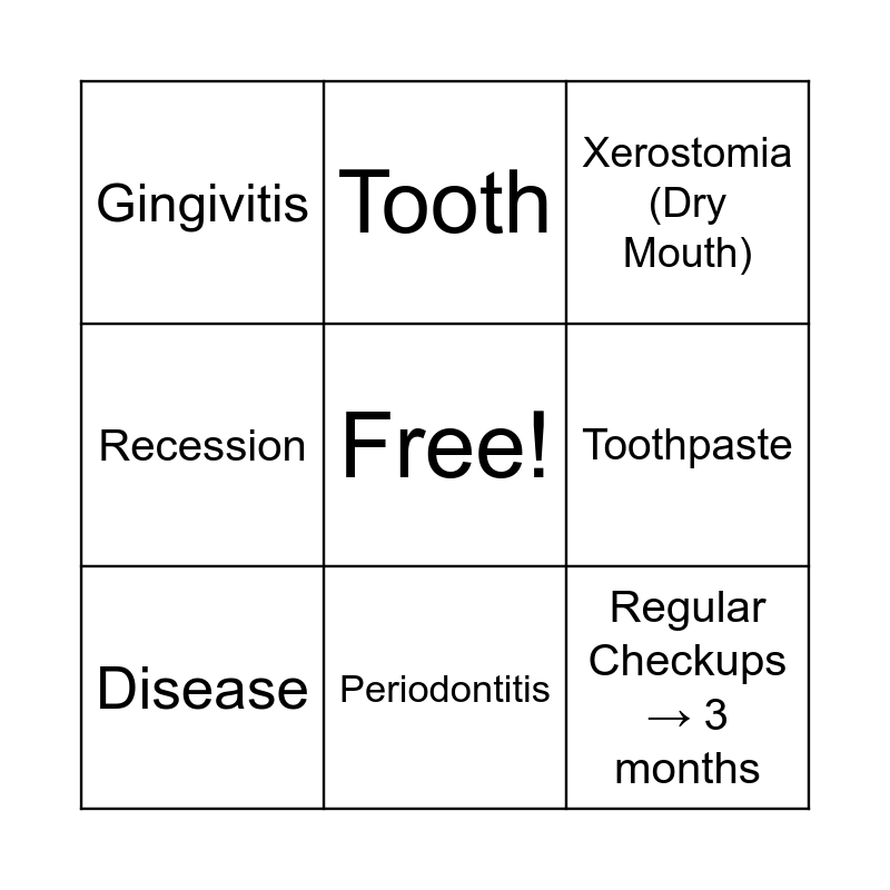 This bingo card has a free space and 15 words: Stay Hydrated, Soft bristled brush/non-abrasive cleaner, Xerostomia (Dry Mouth), Gingivitis, Periodontitis, Regular Checkups → 3 months, Soak denture overnight, Medications, Toothpaste, Bacteria, Pain, Recession, Disease, Tooth and Floss.