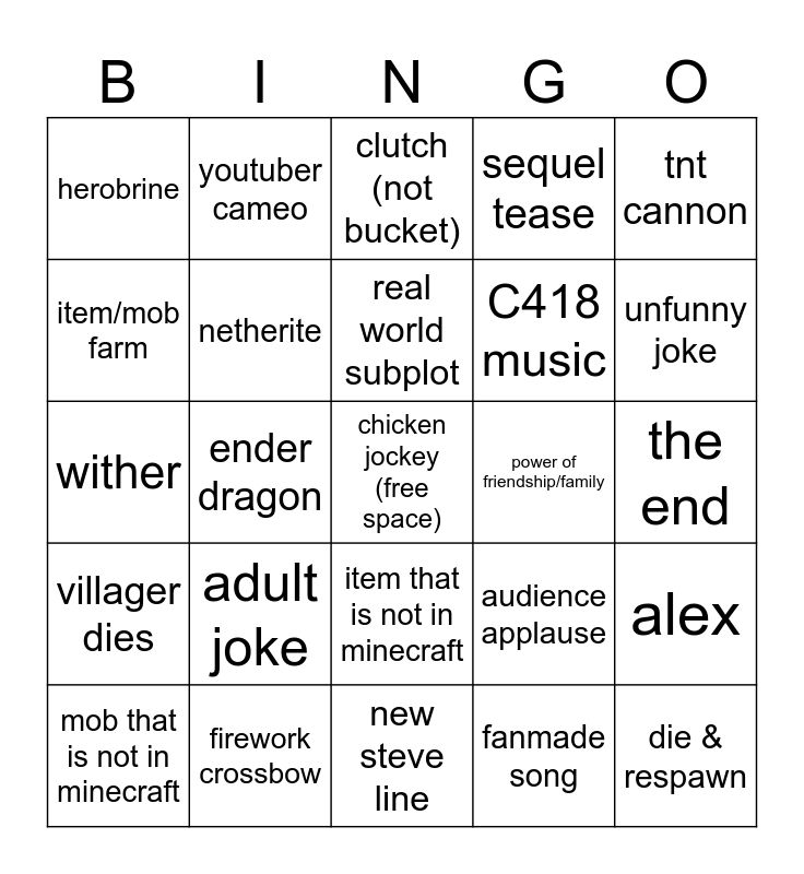 This bingo card has a free space and 24 words: adult joke, firework crossbow, real world subplot, mob that is not in minecraft, tnt cannon, herobrine, item/mob farm, youtuber cameo, power of friendship/family, item that is not in minecraft, C418 music, wither, audience applause, alex, netherite, fanmade song, the end, clutch (not bucket), unfunny joke, ender dragon, die & respawn, villager dies, sequel tease and new steve line.