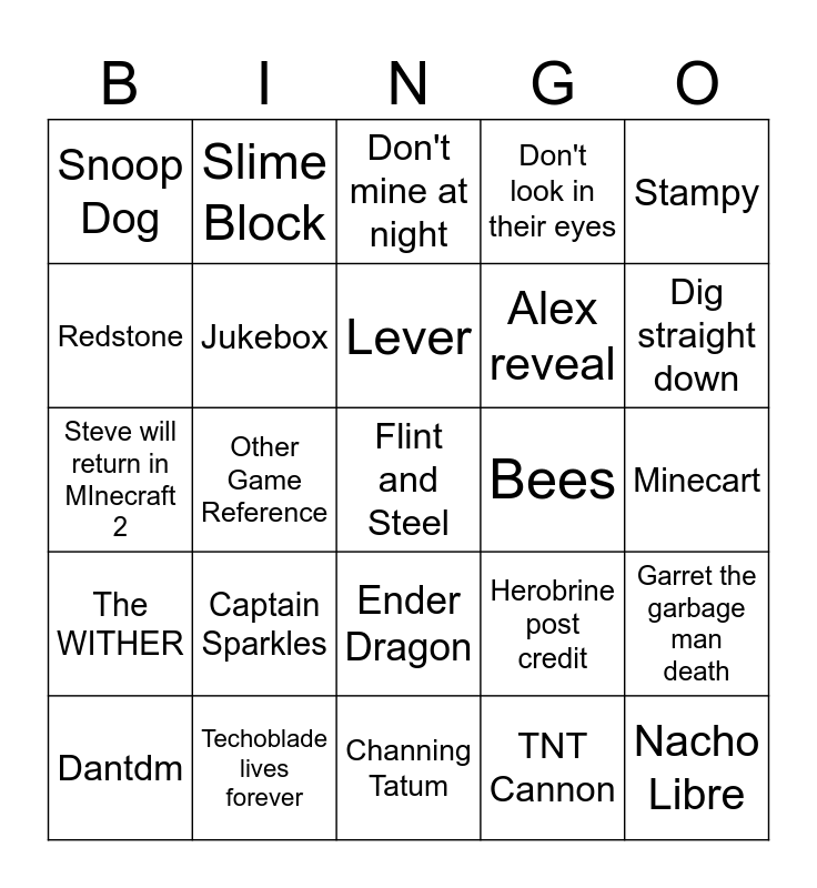 This bingo card has a free space and 24 words: Captain Sparkles, Techoblade lives forever, Lever, Dantdm, Stampy, Snoop Dog, Redstone, Slime Block, Bees, Ender Dragon, Alex reveal, Steve will return in MInecraft 2, Herobrine post credit, Garret the garbage man death, Jukebox, TNT Cannon, Minecart, Don't mine at night, Dig straight down, Other Game Reference, Nacho Libre, The WITHER, Don't look in their eyes and Channing Tatum.