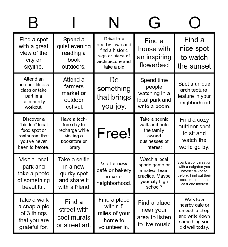 This bingo card has a free space and 24 words: Take a selfie in a new quirky spot and share it with a friend, Find a street with cool murals or street art., Do something that brings you joy., Take a walk a snap a pic of 3 things that you are grateful for., Find a nice spot to watch the sunset, Find a spot with a great view of the city or skyline., Attend an outdoor fitness class or take part in a community workout., Spend a quiet evening reading a book outdoors., Take a scenic walk and note the family owned businesses of interest, Visit a new café or bakery in your neighborhood., Spend time people watching in a local park and write a poem., Discover a “hidden” local food spot or restaurant that you’ve never been to before., Watch a local sports game or amateur team practice. Maybe your city high school?, Spark a conversation with a neighbor you haven't talked to before. Find out their occupation and at least one interest, Attend a farmers market or outdoor festival., Find a place near your area to listen to live music, Find a cozy outdoor spot to sit and watch the world go by., Drive to a nearby town and find a historic sign or piece of architecture and take a pic, Spot a unique architectural feature in your neighborhood, Have a tech-free day to recharge while visiting a bookstore or library, Walk to a nearby cafe or smoothie shop and write down something you did well today., Visit a local park and take a photo of something beautiful., Find a house with an inspiring flowerbed and Find a place within 5 miles of your home to volunteer in..