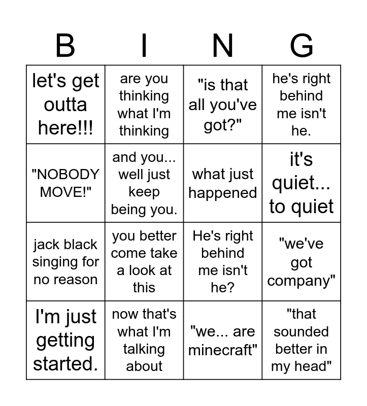 This bingo card has 19 words: He's right behind me isn't he?, cuts to montage, "is that all you've got?", "that sounded better in my head", "we've got company", "NOBODY MOVE!", "we... are minecraft", let's get outta here!!!, are you thinking what I'm thinking, jack black singing for no reason, you better come take a look at this, and you... well just keep being you., what just happened, now that's what I'm talking about, I'm just getting started., it's gonna blow, he's right behind me isn't he., it's quiet... to quiet and "it's gonna blow".