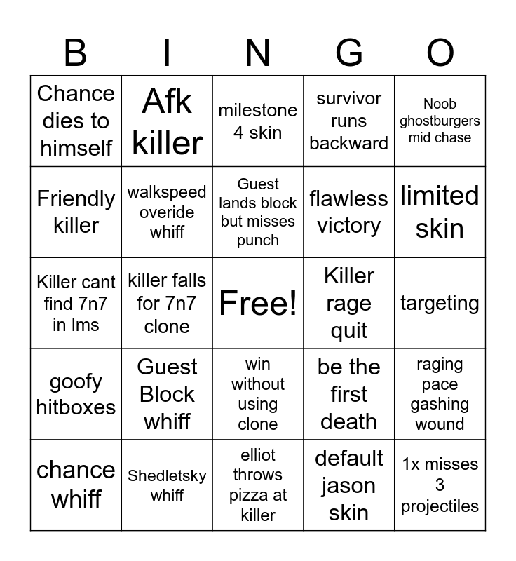 This bingo card has a free space and 24 words: Guest Block whiff, Shedletsky whiff, Guest lands block but misses punch, chance whiff, Noob ghostburgers mid chase, Chance dies to himself, Friendly killer, Afk killer, Killer rage quit, win without using clone, flawless victory, Killer cant find 7n7 in lms, be the first death, raging pace gashing wound, walkspeed overide whiff, default jason skin, targeting, milestone 4 skin, limited skin, killer falls for 7n7 clone, 1x misses 3 projectiles, goofy hitboxes, survivor runs backward and elliot throws pizza at killer.