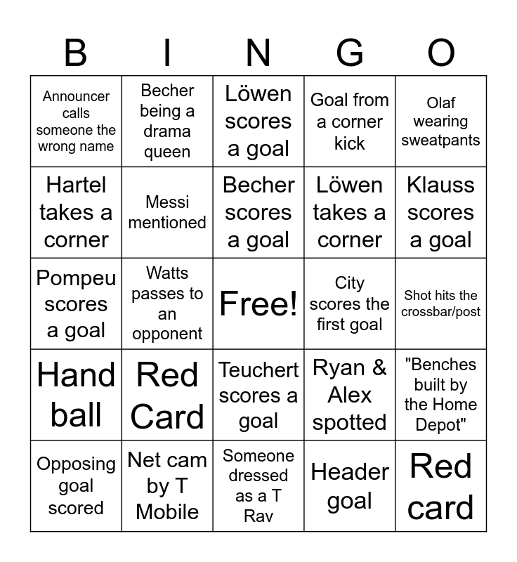 This bingo card has a free space and 32 words: Header goal, Yellow card, Watts passes to an opponent, Visiting supporters shown, Hand ball, Messi mentioned, Olaf wearing sweatpants, "Benches built by the Home Depot", Becher being a drama queen, Goal scored from a free kick, Becher scores a goal, Löwen scores a goal, Odd number of stoppage minutes added, Even number of stoppage minutes added, City scores the first goal, Win probability mentioned, Opposing goal scored, Pompeu scores a goal, Teuchert scores a goal, Red Card, Ryan & Alex spotted, Löwen wearing ripped socks, Shot hits the crossbar/post, Net cam by T Mobile, Red card, Goal from a corner kick, Löwen takes a corner, Hartel takes a corner, Announcer calls someone the wrong name, Someone dressed as a T Rav, 0-0 at halftime and Klauss scores a goal.