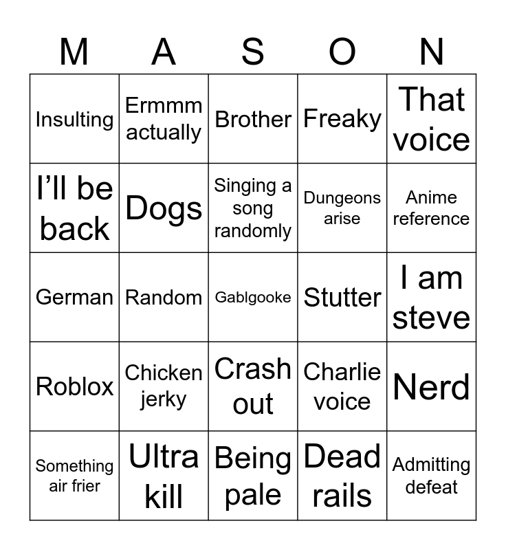 This bingo card has 25 words: Roblox, Ultra kill, Gablgooke, Dead rails, That voice, Insulting, Ermmm actually, Brother, Stutter, Nerd, I’ll be back, Dogs, Being pale, Charlie voice, Anime reference, Something air frier, Random, Singing a song randomly, Dungeons arise, I am steve, German, Chicken jerky, Crash out, Freaky and Admitting defeat.