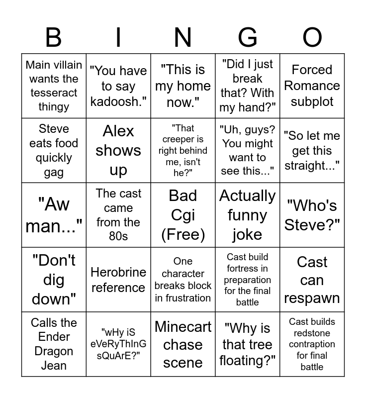 This bingo card has a free space and 24 words: Calls the Ender Dragon Jean, Herobrine reference, "That creeper is right behind me, isn't he?", "Why is that tree floating?", Forced Romance subplot, Main villain wants the tesseract thingy, "You have to say kadoosh.", "This is my home now.", Actually funny joke, "Who's Steve?", "Aw man...", Alex shows up, Cast build fortress in preparation for the final battle, Cast can respawn, Steve eats food quickly gag, "wHy iS eVeRyThInG sQuArE?", Minecart chase scene, "Did I just break that? With my hand?", "So let me get this straight...", "Don't dig down", The cast came from the 80s, One character breaks block in frustration, "Uh, guys? You might want to see this..." and Cast builds redstone contraption for final battle.