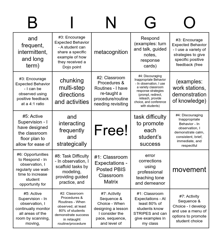 This bingo card has a free space and 26 words: #1: Classroom Expectations - Posted PBIS Classroom Matrix, #1: Classroom Expectations - At least 80% of students know STRIPES and can give examples in my class, #2: Classroom Procedures & Routines - I have re-taught a procedure/routine needing revisiting, #2: Classroom Procedures & Routines - When observed, at least 80% of students demonstrate success in retaught routine/procedure, #3: Encourage Expected Behavior - I use a variety of strategies to give specific positive feedback (free, and frequent, intermittent, and long term), #3: Encourage Expected Behavior - I can be observed using positive feedback at a 4:1 ratio, #3: Encourage Expected Behavior - A student can share a specific example of how they received a Dojo point, #4: Discouraging Inappropriate Behavior - In observation, I demonstrate calm, consistent, brief, immediate, and respectful, error corrections using professional teaching tone and demeanor, #4: Discouraging Inappropriate Behavior - In observation, I use a variety classroom response strategies (prompt, redirect, reteach, provide choice, and conference with students), #5: Active Supervision - I have designed the classroom floor plan to allow for ease of, movement, #5: Active Supervision - In observation, I continually monitor all areas of the room by scanning, moving,, and interacting frequently and strategically, #6: Opportunities to Respond - In observation, I use a variety of strategies to increase student Opportunities to, Respond (examples: turn and talk, guided notes, response cards), #6: Opportunities to Respond - In observation, I regularly use wait-time to increase student opportunity for, metacognition, #7: Activity Sequence & Choice - I develop and use a menu of options to promote student choice, (examples: work stations, demonstration of knowledge), #7: Activity Sequence & Choice - When designing a lesson I consider the pace, sequence, and level of, task difficulty to promote each student’s success, #8: Task Difficulty - In observation, I scaffold tasks by modeling, providing guided practice, and, chunking multi-step directions and activities and FREE SPACE.