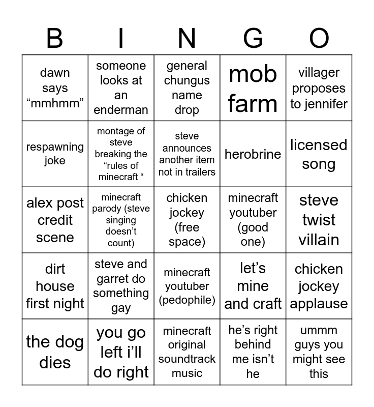 This bingo card has a free space and 24 words: steve and garret do something gay, you go left i’ll do right, steve announces another item not in trailers, the dog dies, villager proposes to jennifer, dawn says “mmhmm”, respawning joke, someone looks at an enderman, minecraft youtuber (good one), minecraft youtuber (pedophile), herobrine, alex post credit scene, let’s mine and craft, chicken jockey applause, montage of steve breaking the “rules of minecraft “, he’s right behind me isn’t he, steve twist villain, general chungus name drop, licensed song, minecraft parody (steve singing doesn’t count), ummm guys you might see this, dirt house first night, mob farm and minecraft original soundtrack music.
