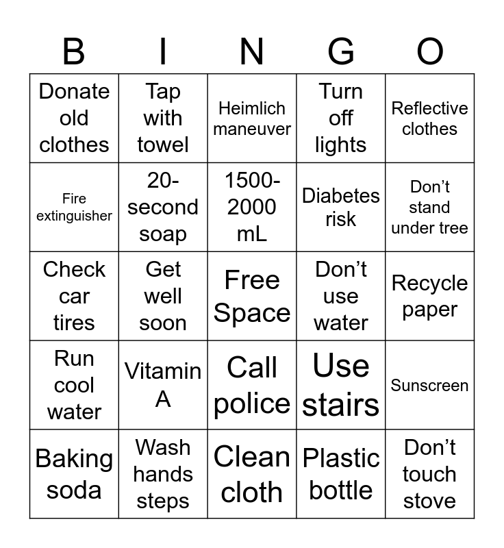This bingo card has a free space and 24 words: Vitamin A, Wash hands steps, 1500-2000 mL, Baking soda, Reflective clothes, Donate old clothes, Fire extinguisher, Tap with towel, Don’t use water, Call police, Diabetes risk, Check car tires, Use stairs, Sunscreen, 20-second soap, Plastic bottle, Recycle paper, Heimlich maneuver, Don’t stand under tree, Get well soon, Don’t touch stove, Run cool water, Turn off lights and Clean cloth.